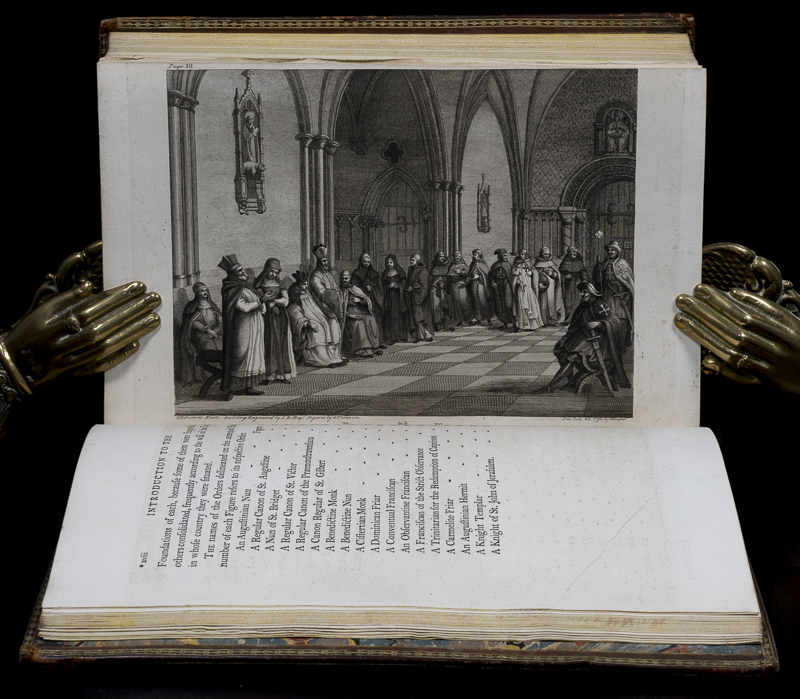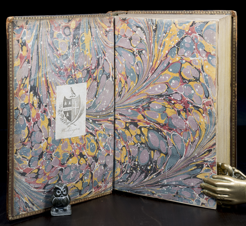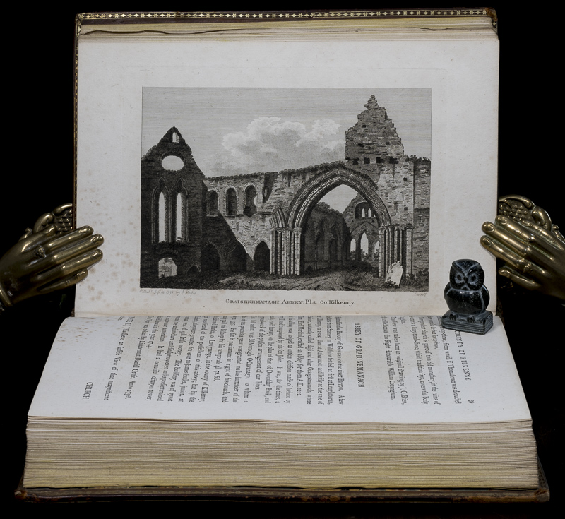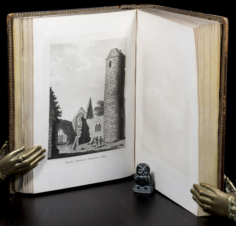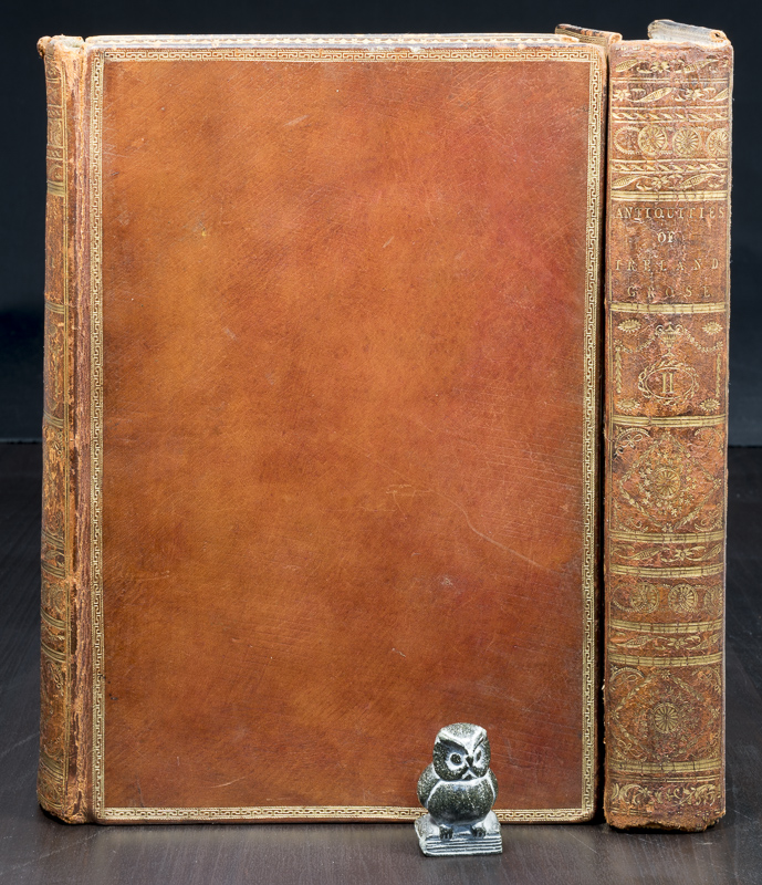 Grose, Francis. The Antiquities of Ireland. First Edition. Two Volumes. London, Printed for S. Hooper, 1791 / 1795. 26 x 17.5 cm. Vol.1: (2), FP, Title Page w/ Vignette, iv, xlii, (18), 88 pages, iv (Index). With 138 Views on 135 Plates (incl. Frontispiece). / Vol.2: (2), FP, Title Page w/ Vignette, xv, 98 pages, vi (Index). With 124 Views on 121 Plates. See comments for more Explantions on Plates. Contemporary polished calf with gilt titles and decorations to boards and spine. Dentelles. Marbled end papers. Armorial Ex Libris (‘Woolsington’). Very good condition. Bindings rubbed and bumped. Edges and end papers age darkened. Both joints of volume 2 are split, but still attached. One leaf (pages 11/12) lose. Page 13 misnumbered as 31. Internally bright and clean. See comments for more information on Plates. There are various discrepancies between the Plates listed in the ‘County Index’ at the back of both Volumes and the Plates in the Book, as follows: