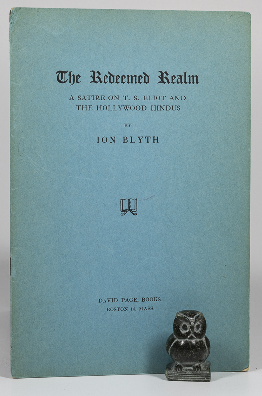 Blyth, Ion. The Redeemed Realm. A Satire on T.S. Eliot and the Hollywood Hindus. First Edition. Boston, David Page Books, 1947. 23 x 15 cm. 19 pages. Original stapled paperback. Very good condition. A bright clean copy with minimal shelf wear.