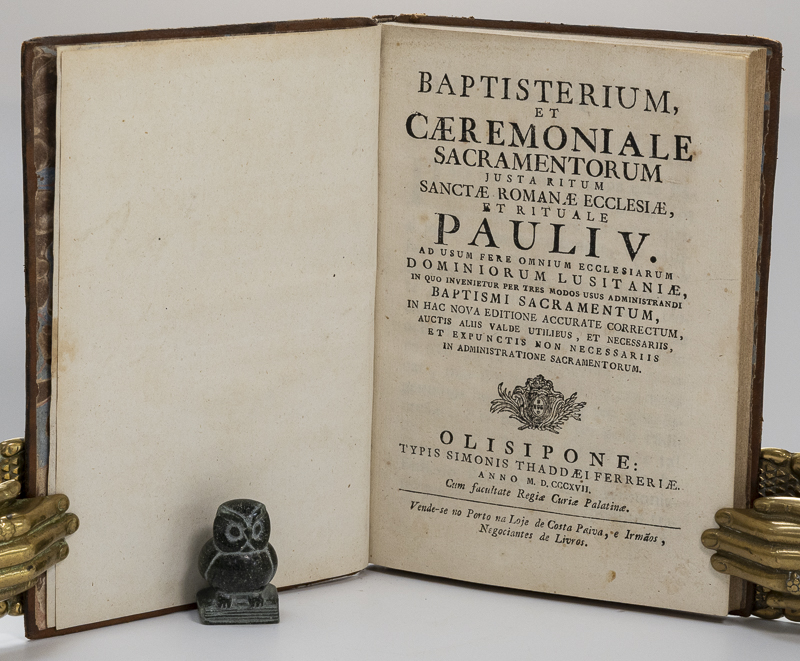 Anon. Baptisterium Et Caeremoniale Sacramentorum Justa Ritum Sanctae Romanae Ecclesiae Et Rituale Pauli V. At usum multorum episcopatuum DOMINORUM LUSITANIÆ, in quo invenietur per tres modos usus administrandi BAPTISMI SACRAMENTUM, in hac nova editione accurate correctum, auctis aliis valde utilibus, et necessariis, et expunctis non necessariis in administratione sacramentorum. Lisbon, Typis Simonis Thaddaei Ferreriae, 1817. 19 x 14 cm. TP, (4), 143 pages, (2) [Index]. Attractive speckled calf. Red spine label. Gilt title and decorations. Marbled end papers. Very good condition. Minor shelf wear. Mild age darkening. A very clean copy in an attractive leather binding.