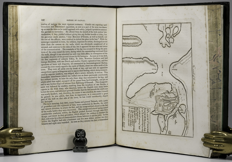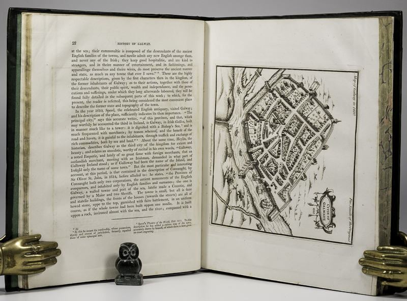 Hardiman, James. The History of the Town and County of the Town of Galway. From the earliest Period to the present Time, embellished with several Engravings. To which is added a copious Appendix, containing the principal Charters and other original Documents. First Edition. Dublin, Printed by W. Folds and Sons, 1820. 27 x 22 cm. xvi, 316 pages, lvi, (4) [Index]. Complete with all the Plates and Plans listed, some of which are folding. Contemporary half leather over cloth covered boards. Green end papers. Marbled edges. Very good condition. Some shelfwear rubbing and bumping. Edges dust dulled. Occasional very mild foxing / staining. All plates and maps in very good condition. A very nice copy.
