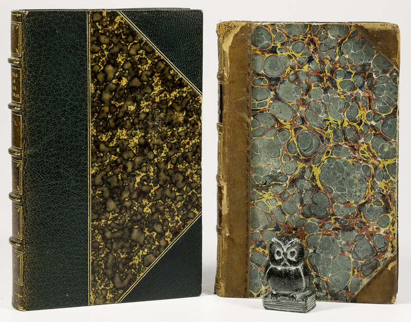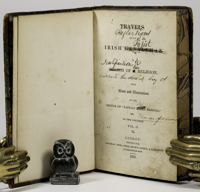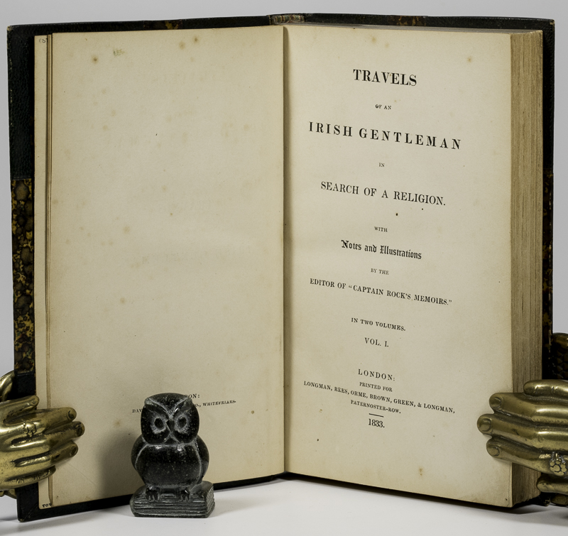 [Moore, Thomas]. Travels of an Irish Gentleman in Search of a Religion. With Notes and Illustrations by the Editor of “Captain Rock’s Memoirs”. In Two Volumes. First Edition. Two Volumes. London, Longman, Rees, Orme, Brown, Green, & Longman, 1833. c. 16 x 10 cm. Vol.1: xii, 335 pages / Vol.2: vii, 354 pages. Non-Uniform half leather over marbled boards. Please see images. Marbled end papers. Volume 2 with marbled edges. Very good condition. Some annotations on title page of volume 2 (see image). A good reading copy.