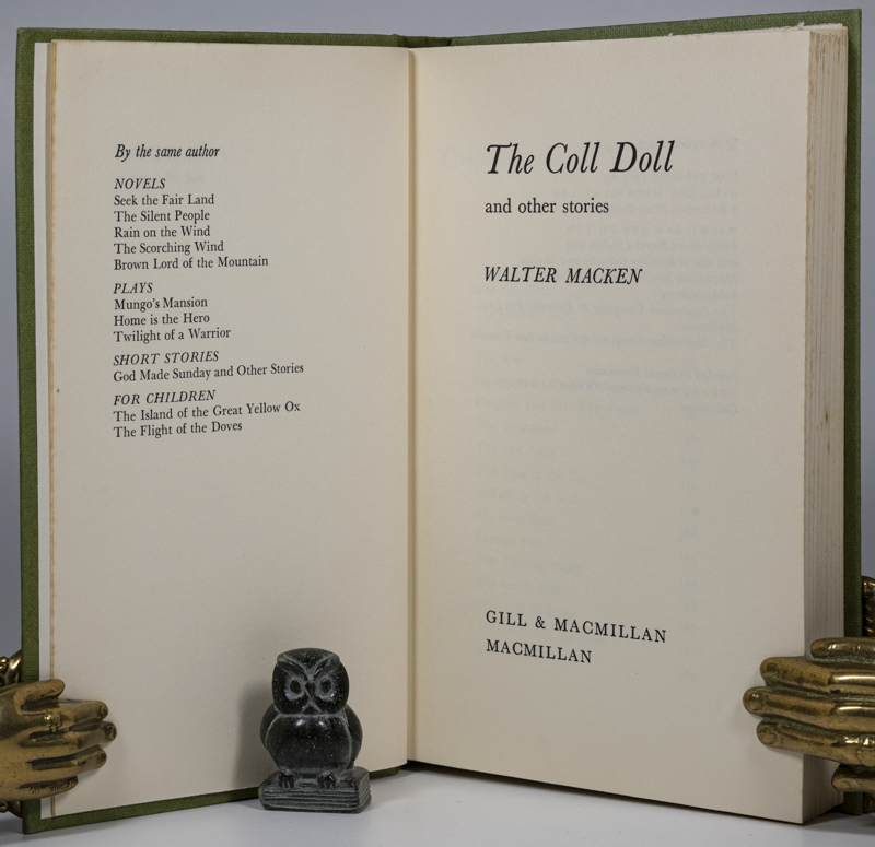 Macken, Walter. The Coll Doll and other stories. First Edition. Dublin / London, Gill & Macmillan / Macmillan, 1969. Octavo. 250 pages. Original green cloth with silver title on spine. Very good condition. Minor shelf wear. Edges dust dulled and mildly foxed. Internally clean.