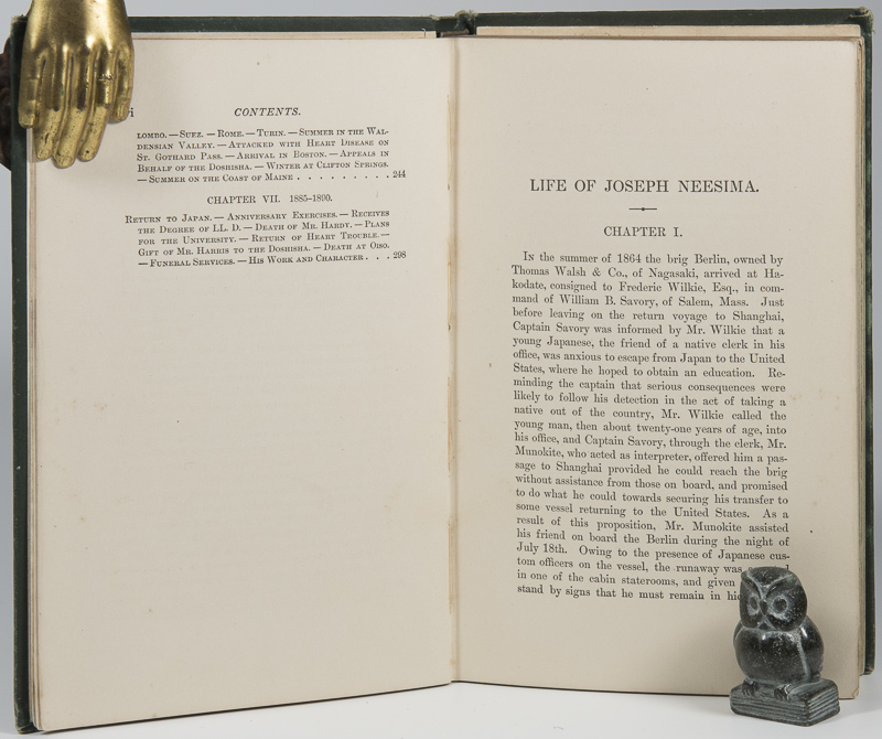 Hardy, Arthur Sherburne. Life and Letters of Joseph Hardy Neesima. Third Edition. Boston and New York, Houghton, Miflin, The Riverside Press, 1892. 19 x 13 cm. vi, 350 pages. With a frontispiece and two more plates. Original green cloth with gilt title on spine. Good condition. Binding rubbed and bumped. Spine ends frayed. Hinges cracked. Binding a little shaky, but holding. Free end papers missing. Some pages dog-eared, some rough cut, but not affecting text block. Joseph Hardy Neesima (1843 – 1890) was a Japanese missionary and educator of the Meiji era who founded Doshisha University and Doshisha Women’s College of Liberal Arts. (Wikipedia)