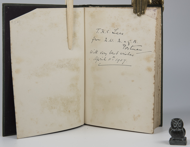 Cripps, Wilfred Joseph. Old English Plate. Ecclesiastical, Decorative, and Domestic: Its Makers and Marks. Ninth Edition. London, John Murray, 1906. 23 x 15 cm. xxiv, 524 pages. With 131 Illustrations and upwards of 2,600 Facsimiles of Plate Marks. Original green cloth with gilt decorations and title on spine. Dark end papers. Very good condition. Binding rubbed, bumped and damp stained. Edges and end papers age darkened. One corner cut of front free end paper. Gift inscription in ink: ‘T.K.E.Lees from M.W.M. & G.B. Portman With very best wishes April 11th 1907’. Some pages uncut. Occasional foxing throughout. Provenance: From the library of Sir Thomas Evans Keith Lees, 2nd Baronet (1886-1915). Later from the Library of Sir Alan Francis Brooke, Field Marshal Alanbrooke, 1st Viscount Alanbrooke.