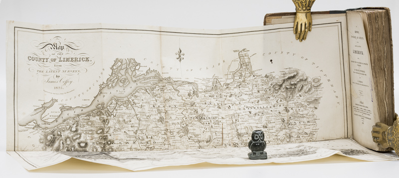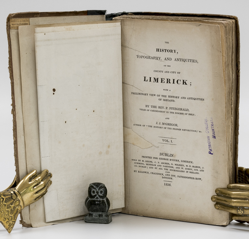 Fitzgerald, Rev. P. / M’Gregor, J.J. The History, Topography, and Antiquities, of the County and City of Limerick. With a preliminary View of the History and Antiquities of Ireland. By the Rev. P. Fitzgerald. Vicar of Cahircorney in the Diocese of Emly and J. J. M’Gregor, Author of “The History of the French Revolution” &c. First Edition. Two NON-UNIFORM Volumes. Dublin, Printed for George M’Kern, Limerick. Also by Baldwin, Chadock, and Joy, London, 1826 & 1827. 21 x 13.5 cm. Vol.1: ii, 424 pages. With a large folding Map of the County of Limerick, a folding distance Table and two engraved Plates. / Vol.2: x, 623 pages, lxvi [Appendix], (20) [Index]. With a Frontispiece and two more engraved Plates. The folding Map of Limerick is not present. Vol.1: Stiff card boards held together by spine tape. Front board almost disconnected. Ex Libary with a library stamp on the title page and three further pages (209,0301 & 361). / Vol.2: Contemporary red half calf over marbled boards. Gilt title and line decorations on spine. Fair condition. Rubbed, bumped and dust dulled. Small book sellers stamp on front past downs. Name and Address of previous owner in pencil on front free end paper. Occasional mild foxing / damp & ink staining, otherwise internally clean. Rear hinge cracked, but binding sound. A good reding copy or candidate for rebinding.