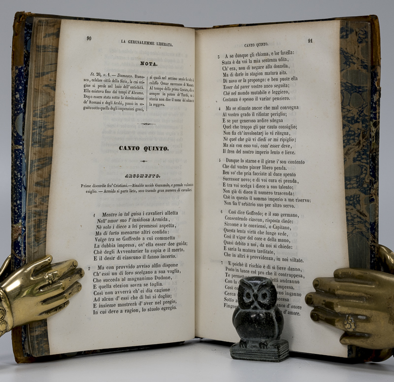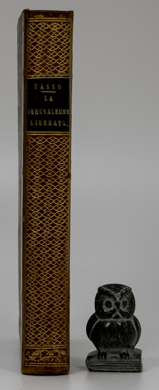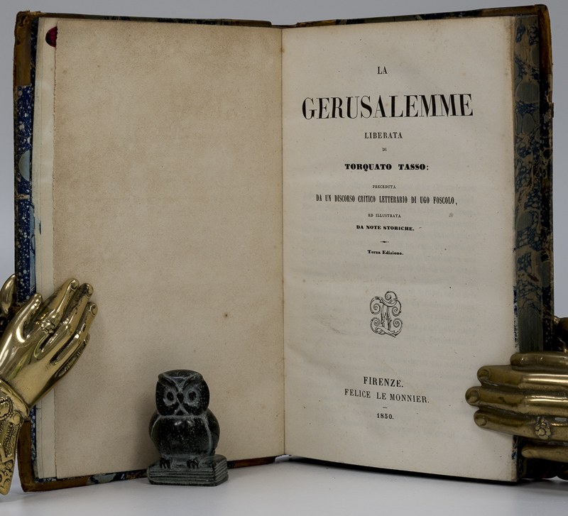 Toquato Tasso. La Gerusalemme Liberata di Torquato Tasso. Preceduta da un Discorso Critico Letterario di Ugo Foscolo, Ed Illustrata da Note Storiche. Terza Edizione. Firenze, Felice Le Monnier, 1850. 17 x 11.5 cm. xx, 440 pages. Contemporary half calf over marbled boards. Marbled end papers and edges. Black spine label with gilt title. Gilt decorations. Very good condition. Minor shelf wear, rubbing and bumping. Edges dust dulled. Ex Libris of previous owner on front past down (‘Josephine Martineau’). Internally clean. A nice copy in a very pretty binding. Torquato Tasso (1544 – 1595) was an Italian poet of the 16th century, best known for his poem Gerusalemme Liberata, in which he depicts a highly imaginative version of the combats between Christians and Muslims at the end of the First Crusade, during the Siege of Jerusalem.