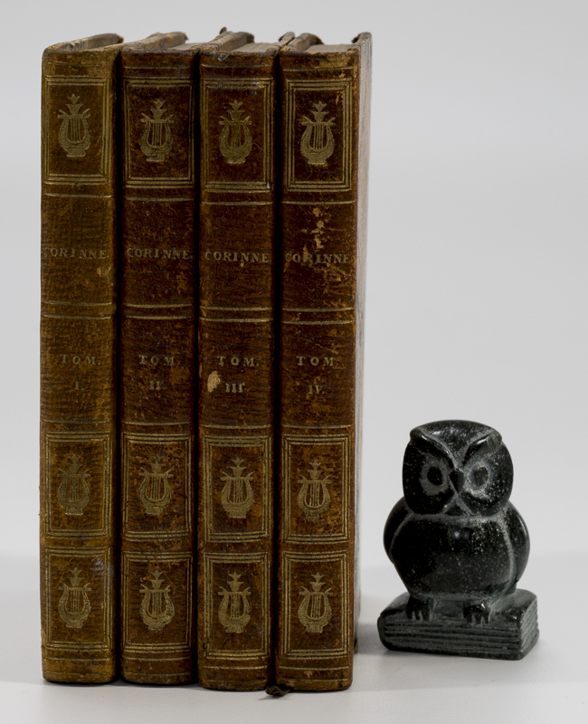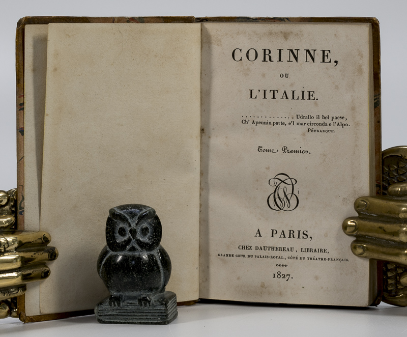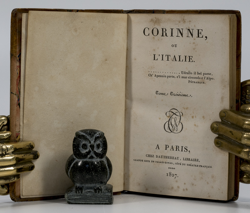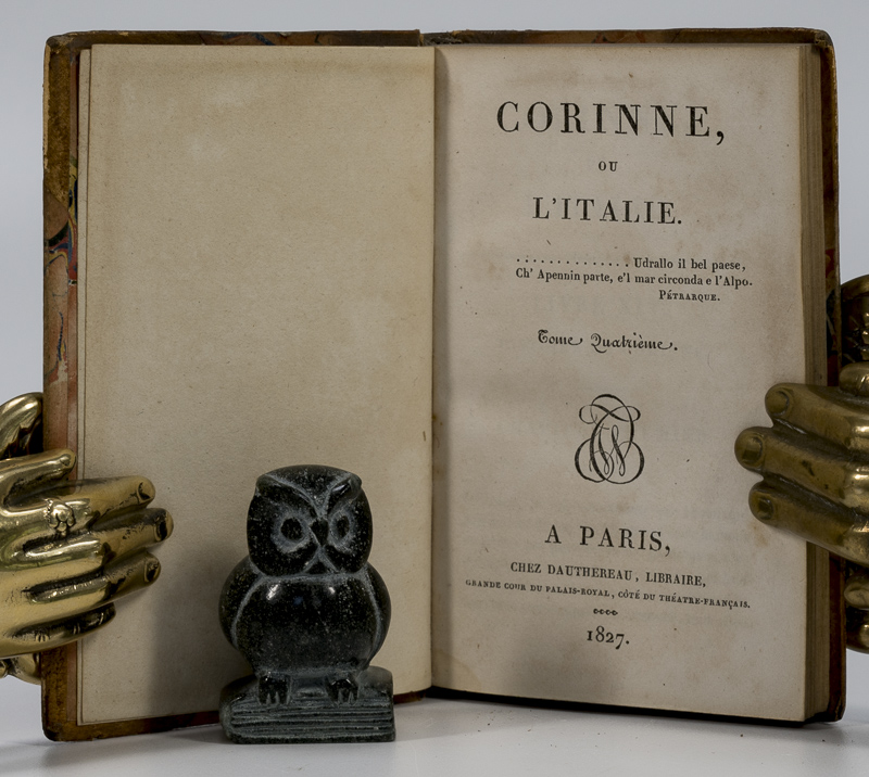 [STAËL, Madame de]. Corinne, Ou L’Italie Four Volumes. Paris, Chez Dauthereau, 1827. 11 x 7 cm. 212, 205, 193 & 199 pages. Contemporary half leather over marbled boards. Marbled end papers. Very good condition. Sopme shelf wear, internally dust dulled, but otherwise clean. Name of previous owner on versos of front free end papers. A nice solid set.