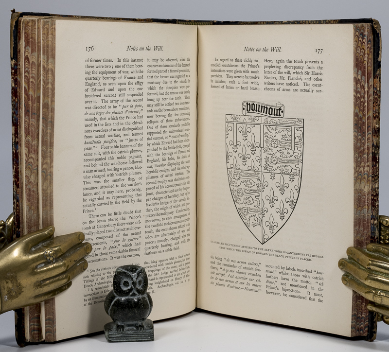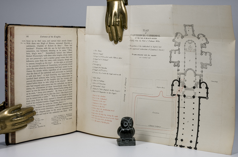 | Stanley, Arthur P. Historical Memorials of Canterbury. The Landing of Augustine. The Murder of Becket. Edward the Black Prince. Becket’s Shrine. With Illustrations. Fourth Edition. London, John Murray, 1865. 18 x 1 cm. 302 pages. With a frontispiece, a folding plan and other illustrattions in text. Contemporary half calf over marbled boards. Marbled end papers. Red morroco spine label with gilt title. Gilt decorations. Very good condition. Some shelf wear, rubbing and bumping. Name of previous owner on first blank, dated 1869.Edges dust dulled. Long closed tear to page 107/108. Internally bright and clean.