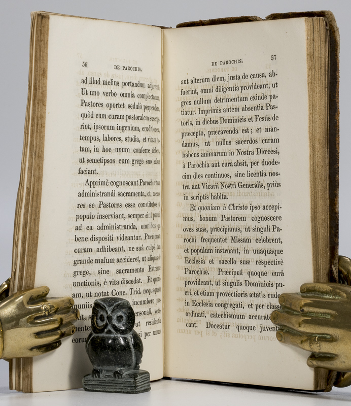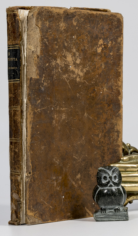 Various Authors. Statuta Dioecesana per Provinciam Dubliniensem. Observanda, et a RRmis. DD.DD. Daniele Murray, Archiepiscopo Dubliniensi, Jacobo Keating, Jacobo Doyle et al. [Incl. Appendices: Rules for Conducting Ecclesiastical Conferences in the Province of Dublin / Rules of the Society of the Christian Doctrine et al.] [First Edition]. Dublinii [Dublin], Ex Typ. Richardi Coyne, 1831. 17 x 10.5 cm. 118 pages [Main text in Latin], xxxii [Appendices in English and Latin]. Original plain leather binding. Black title label on spine. Gilt decorations. Very good text block in fair binding. Binding rubbed and bumped with material losses. Front board detached. Edges and end papers age darkened. Internally clean.