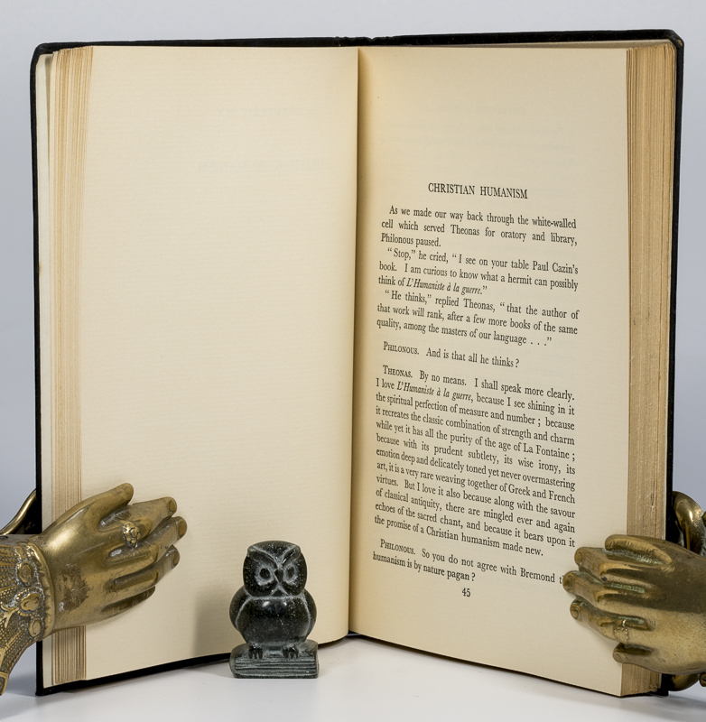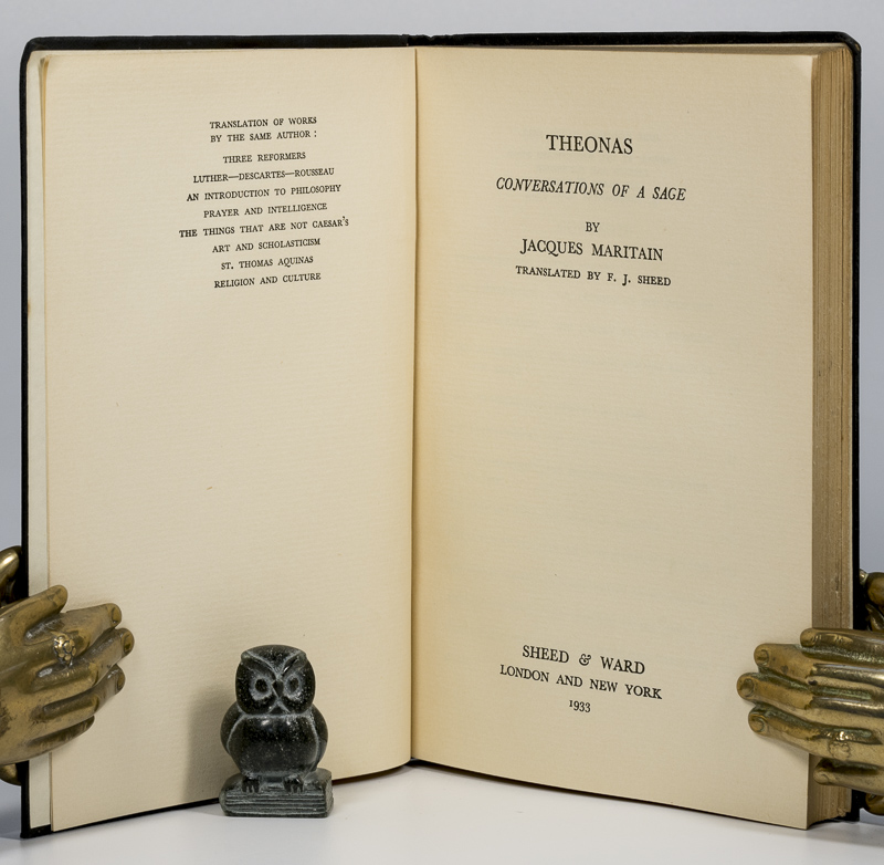 | Maritain, Jacques. Theonas. Conversations of a Sage. Translated by F.J. Sheed. First Edition. London and New York, Sheed & Ward, 1933. 19 x 13 cm. viii, 200 pages. Original dark cloth with gilt title on spine. Very good condition. Minor shelf wear, rubbing and bumping. Edges dust dulled. Internally clean. A nice copy.