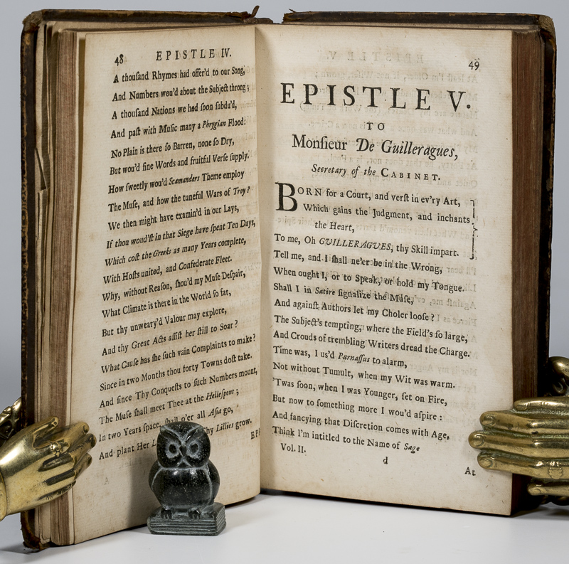 Boileau Despreaux, [Nicolas] (1636-1711). The Works of Monsr. Boileau Despreaux. Containing: 1 Longinus’s Treatise of the Sublime. With Critical Reflections on some Passages out of Longinus, wherein Answer is occasionally made to some Objections of Monsieur Perrault against Homer and Pindar: Likewise further Remarks and Observations by Dacier, Boivin &c. / 2. Miscellanies, with a Discourse upon Satire. [Incl. Epistles / New Epistles / An Ode on the Taking of Namur, Anno 1692 / A Discourse Upon Ode / Epigrams and Other Pieces / A Treatise of the Sublime / Index]. Volume 2 Only. London, Printed for E. Sanger, and E. Curll, 1711. 19 x 12 cm. Frontispiece, Title page, 189 pages [ Epistles / New Epistles] / Odes / Epigrams and Other Pieces] / 267 pages [Treatise of the Sublime], (16) [Index and Errata]. Contemporary calf. Spine labels with gilt title. Very good condition. Rubbed, bumped and age darkened. Joints cracked, but binding remains sound. Name of previous owner (‘JohnGeoBoileau’) on first blank. Internally age darkened, but clean.