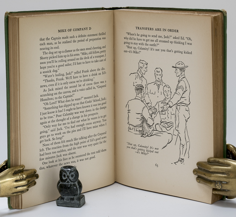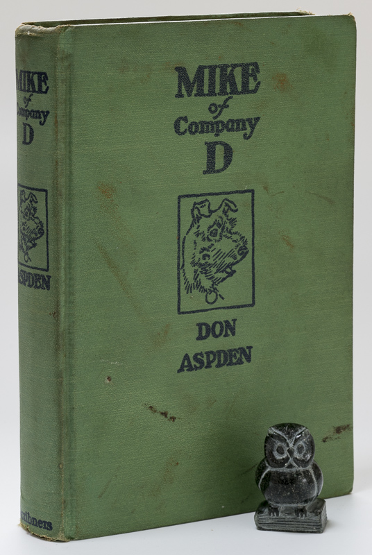 Aspden, Don (author) / Brown, Paul (illustrations). MIKE of Company D. With drawings by Paul Brown. First Edition. New York, Charles Scribner’s Sons, 1939. 20 x 13.5 cm. viii, (2), 261 pages. Illustrated throughout. Original green cloth with title and author on front board and spine. Very good condition. Binding rubbed, bumped and age darkened. Spine ends mildly frayed. A few small stains (see images). Edges and end papers age darkened. Front hinge cracked. Name of previous owner on front paste down. Internally a very clean copy.