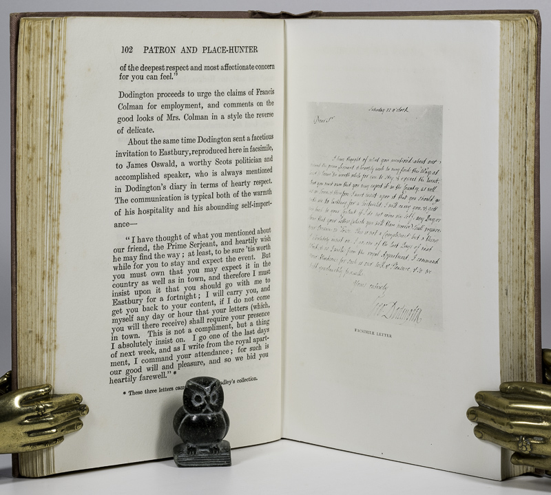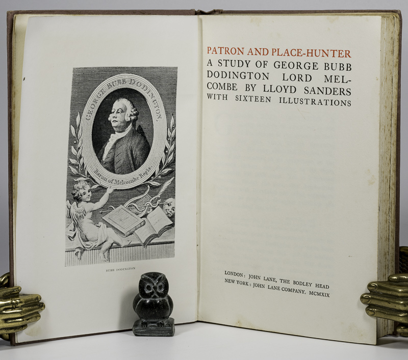 Sanders, Lloyd. Patron and Place-Hunter. A Study of George Bubb Dodington Lord Melcombe. London & New York, John Lane, The Bodley Head, 1914. 21 x 14 cm. xiv, 294 pages. Illustrated. Original cloth. Hard cover. Gilt title on spine. Very good condition. Ex Libris and name of previous owner neatly inscribed. Otherwise clean.