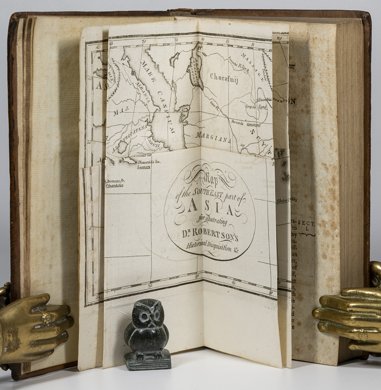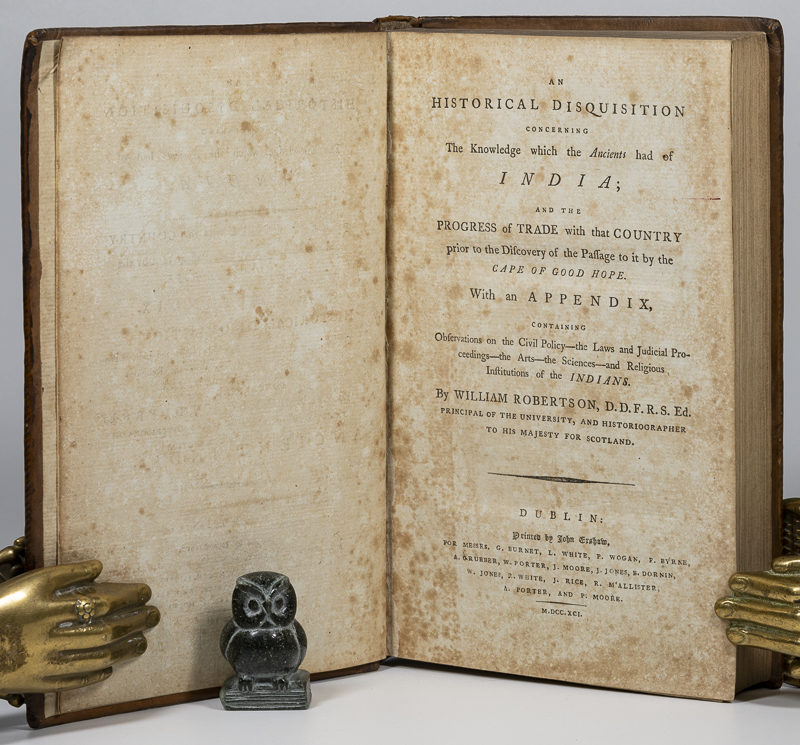 Robertson, William. An Historical Disquisition concerning the Knowledge which the Ancients had of India. And the Progress of Trade with that Country prior to the Discovery of the Passage to it by the Cape of Good Hope. With an Appendix, containing Observations on the Civil Policy – The Laws and Judicial Proceedings – the Arts – the Sciences – and Religious Institutions, of the Indians. Scarce First Dublin Edition. Dublin, Printed by John Ershaw for G. Burnet, L. White, P. Wogan, P. Byrne et al., 1791. 21 x 13 cm. vi, (2), Large folding map (of two) [Map of the South East part of Asia], 349 pages, (14) [Index]. Contemporary full calf. Black spine lable with gilt title. Very good condition. Minor shelf wear, rubbing and bumping. Edges and end papers dust dulled. Mildly age darkened. Lacking one of the two folding maps. A very good reading copy in a sound binding.