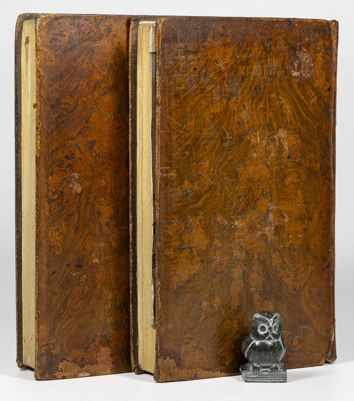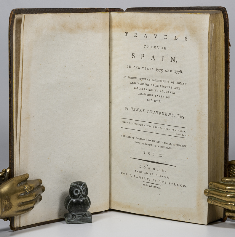 | Swinburne, Henry. Travels through Spain in the Years 1775 and 1776. In which several Monuments of Roman and Moorish Architecture are Illustrated by Accurate Drawings taken on the Spot. The second Edition, to which is added a Journey from Bayonne to Marseilles. Two Volumes. London, Printed by J. Davis for P. Elmsly, 1787. 21 x 13 cm. Vol.1: xvii, (6) [TOC], 373 pages, (6) [Index] / Vol.2: (6) [TOC], 469 pages, (6) [Index]. Complete with 13 Plates and Maps, of which most are folding. Contemporary tree calf. Black spine lables with gilt titles. Gilt decorations. See images. Very good condition. Some shelaf wear, rubbing and bumping. Front joints cracked, but holding. Edges and end papers dust dulled. Internally bright and clean. A nice set.