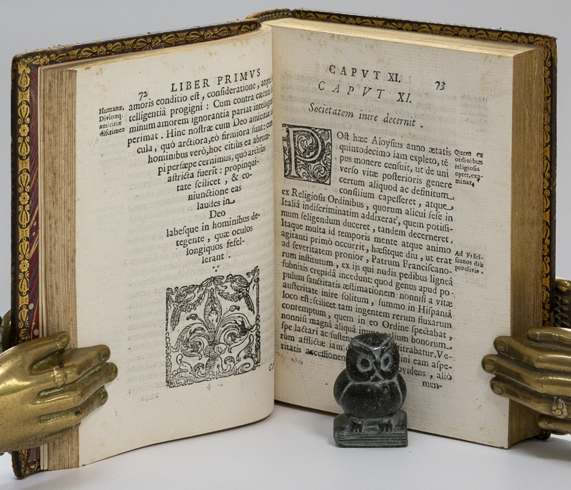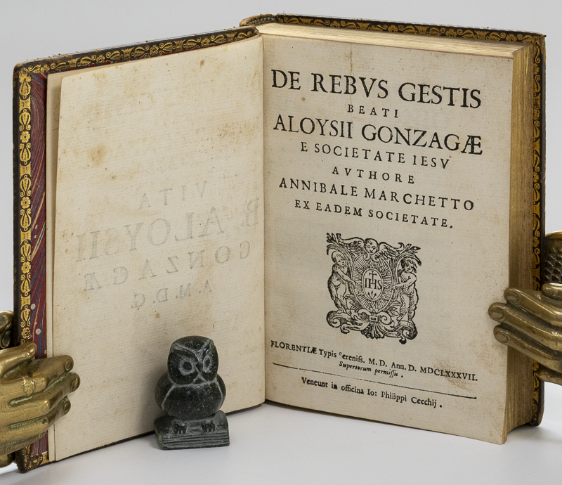 Marchetto, Annibale, [San Luigi Gonzaga]. De Rebus Gestis Beati Aloysii Gonzagae E Societate Iesu. [First Edition]. Florence, Typis Sereniss, 1687. Octavo. TP, (12), 374 pages, (18) [Index & Errata]. Small vignettes and leading letters in text. Later fine calf. Gilt title and decorations. Dentelles. Marbled end papers. All edges gilt. Very good condition. Ex LIbris of previous owner on front paste down. A bright clean copy in an attractive binding. See images.