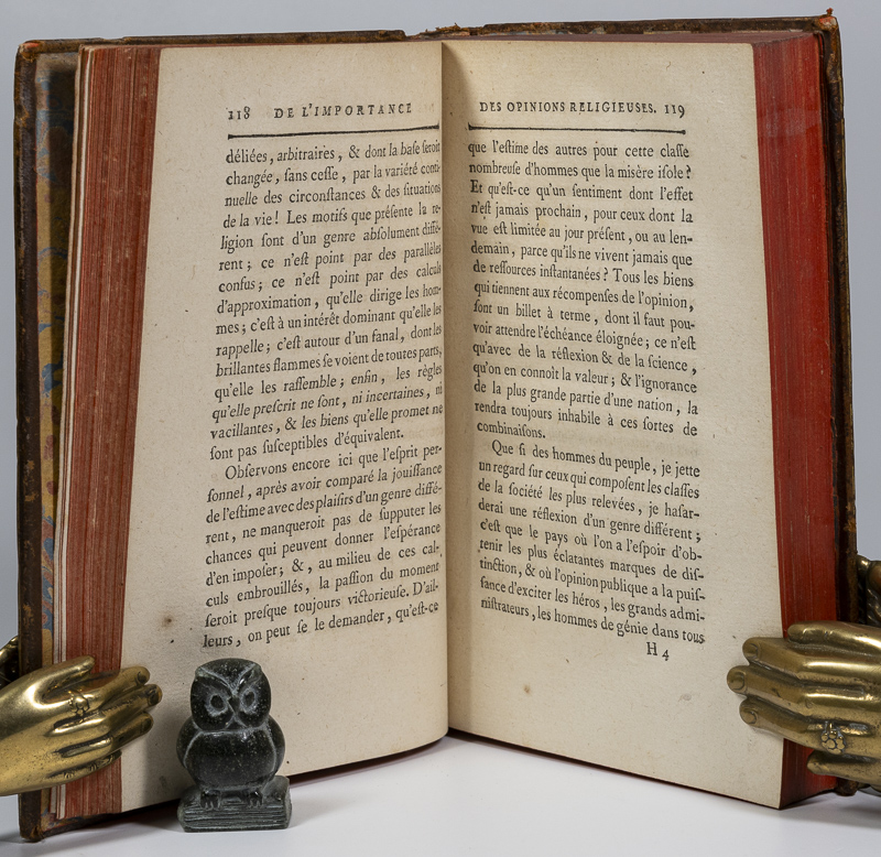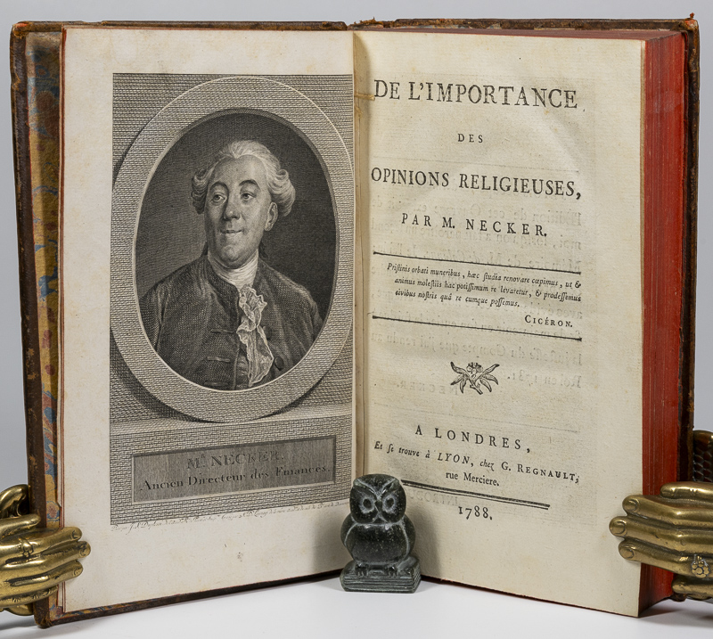 Par M. Necker, [Jacques]. De L’Importance Des Opinions Religieuses First Edition. A Londres, et se trouve à Lyon, chez G. Regnault, 1788. c, 19 x 12 cm. Title page, 542 pages (2). With a Frontispiece. Contemporary speckled calf. Elaborate gilt decorations to spine. Gilt title. Marbled end papers. Red edges. Very good condition. Some shelf wear, rubbing and bumping. Edges dust dulled. Internally bright and clean. A lovely copy. See images.