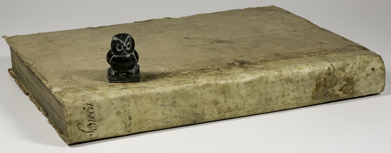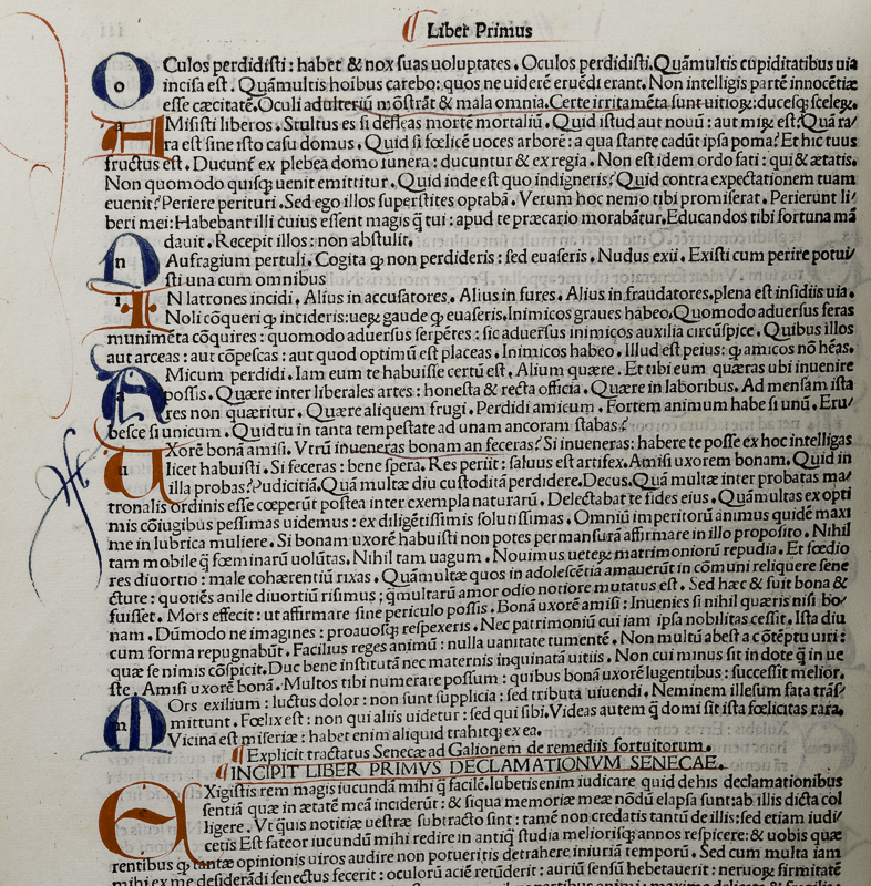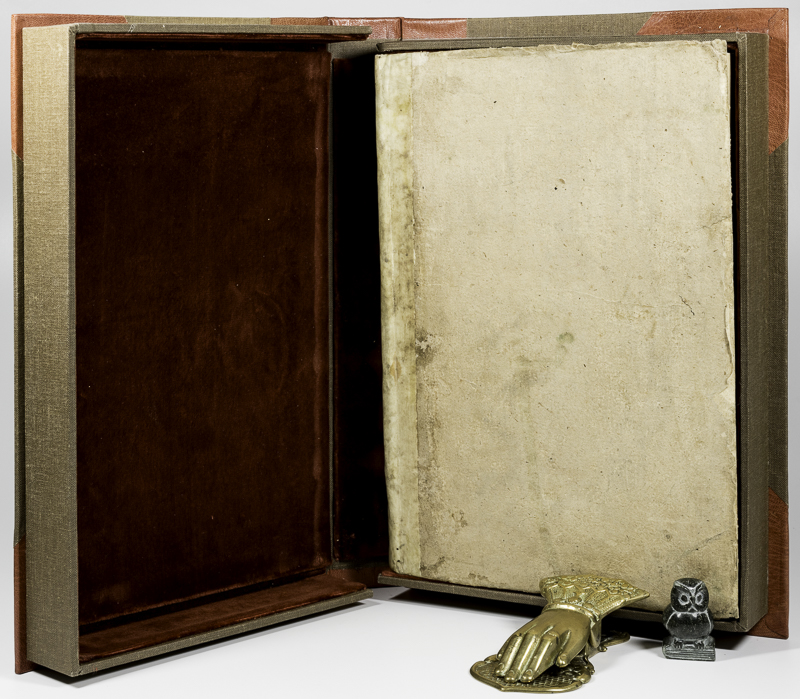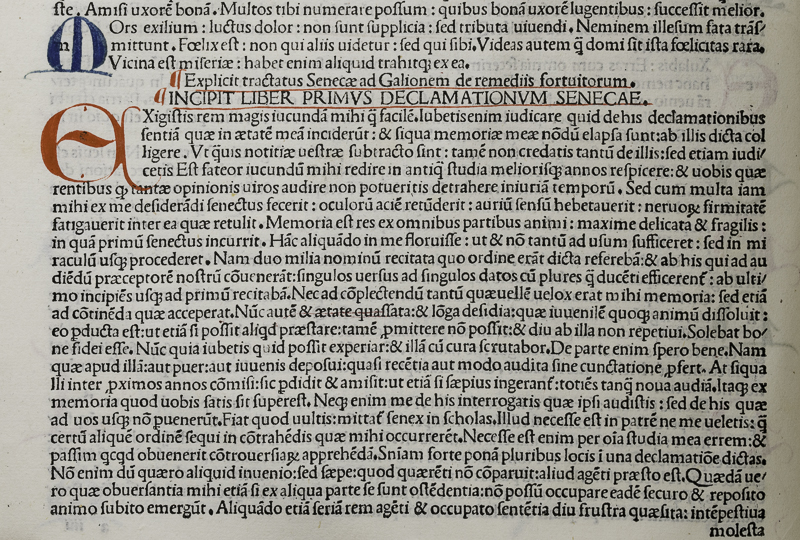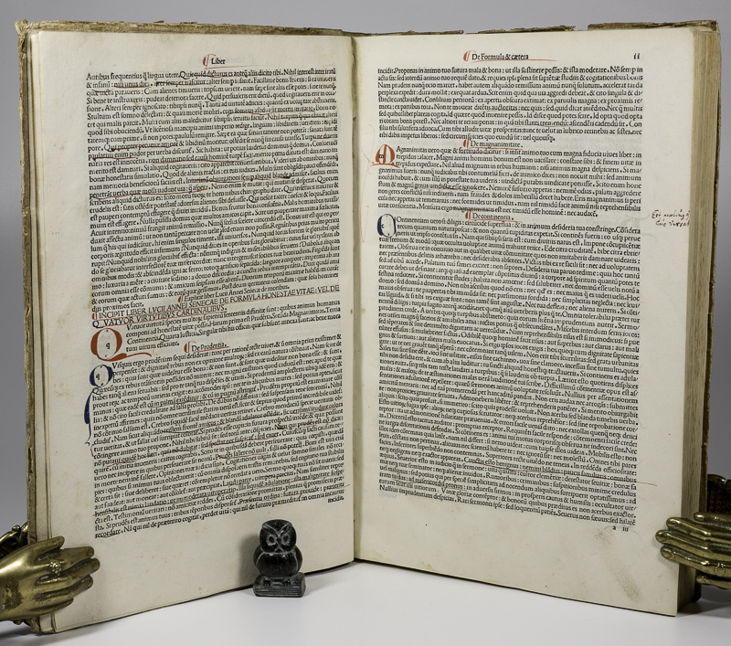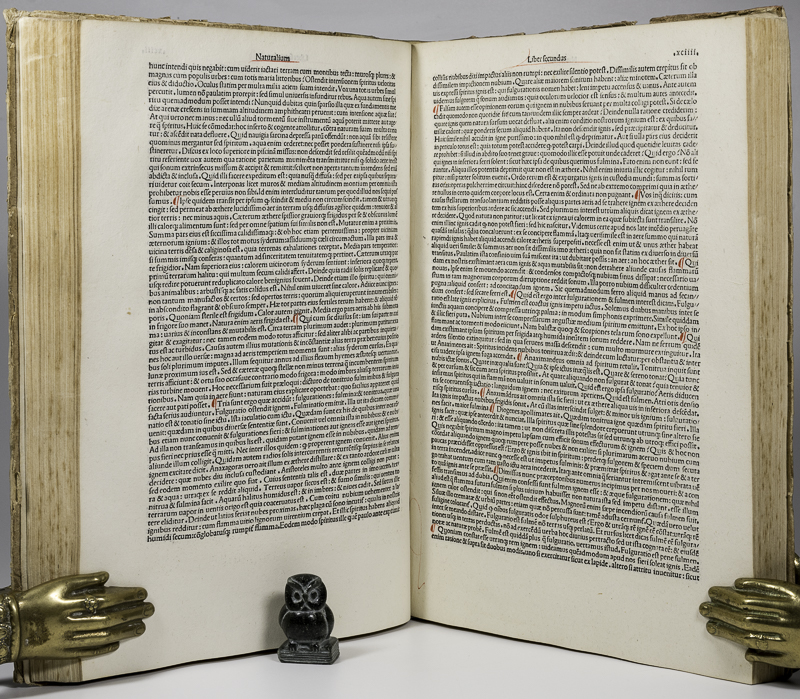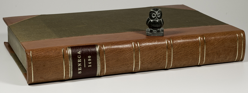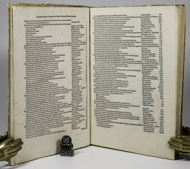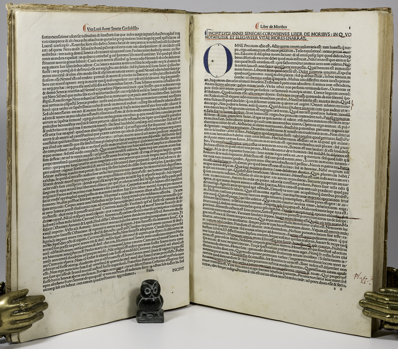 Seneca, Lucius Annaeus. Seneca Moralis. Venice, Bernardinum de Cremona & Simonem de Luero, October 5, 1490. 31.0 x 20.5 cm. Title page, (3) [TOC], 147 pages, 66 pages. Collation [+2, a8-r8, s6-t6, A8-G8, H9], Registrum: +i, a iiii, b iiii, c iiii,d iiii, f iiii,g iiii, h iiii,i iiii, k iiii, l iiii, m iiii, n iiii, o iiii, p iiii, q iiii, r iiii, s iii, t iii, A iiii, B iiii, C iiii, D iiii, E iiii, F iiii, G iiii, H v. Quarter vellum over stiff cardboard. Handwritten author’s name on spine. Now inside a velvet lined half morocco clamshell box with spine label and gilt decorations. Very good condition. Exteriors rubbed and bumped, some abrasion to boards (see images). Edges and end papers dust dulled. Full page Ex Libris on front paste down. Tiny worm trail on front free end paper and first two leaves. Name of a previous owner on bottom of page a1. Occasional very mild foxing. Very few annotations. Rubricated in red and blue throughout the book. A wonderful copy. Lucius Annaeus Seneca the Younger c. 4 BC – AD 65), usually known as Seneca, was a Stoic philosopher of Ancient Rome, a statesman, a dramatist, and in one work, a satirist, from the post-Augustan age of Latin literature.