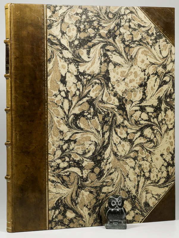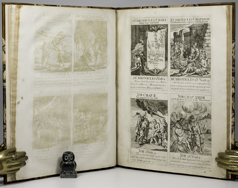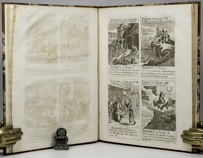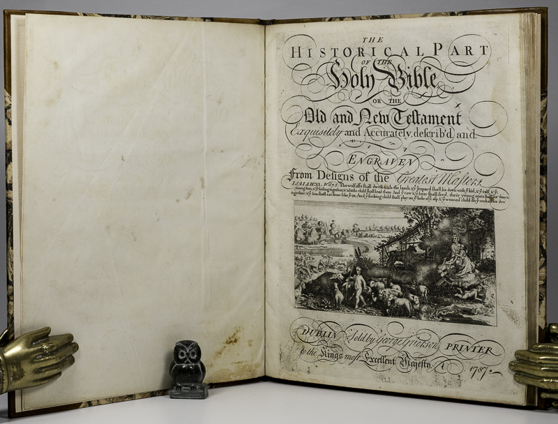 Anon. The Historical Part of the Holy Bible. Or the Old and New Testament Exquisitely and Accurately describ’d and Engraven from Designs of the Greatest Masters. Dublin, Sold by George Grierson, Printer to the Kings most Excellent Majesty, 1787. 28 x 22 cm. Engraved title page, followed by 57 numbered and engraved pages, each with four biblical scenes. One blank page. Later fine polished half calf over marbled paper boards. New end papers. Raised bands. Gilt and blind decorations. Very good condition. Binding near fine. Internally mildly age darkened. Occasional mild foxing / staining. No inscriptions / annotations. Last page (57) bound upside down.