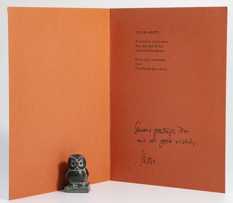 Fallon, Peter. The Blaskets. [Folding Christmas Card with a Poem by Peter Fallon, incribed and signed ‘Peter’]. Oldcastle, [The Gallery Press], 2001. Fine condition.