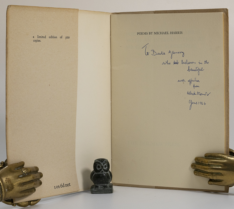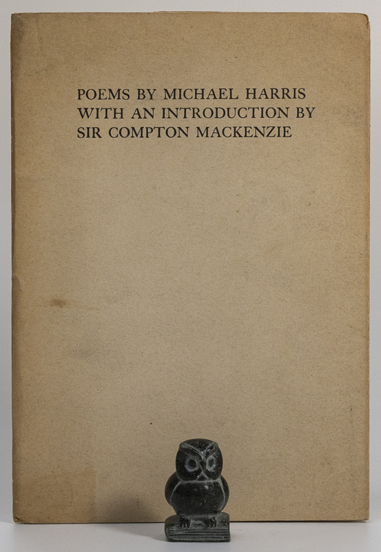 Harris, Michael (author) / Mackenzie, Compton (introduction) / O’Connor, Ulick (inscription). Poems by Michael Harris. With an Introduction by Sir Compton Mackenzie. First and limited edition of 500 copies. Dublin, The Dolmen Press, 1965. 22 x 15 cm. 28 pages. Original stiff paper wrappers. Very good condition. Wrappers dust dulled. Gift inscription, signed by Ulick O’Connor on half title page. Internally bright and clean.