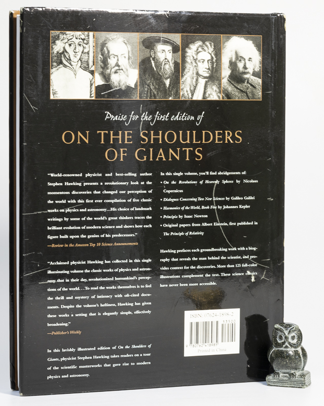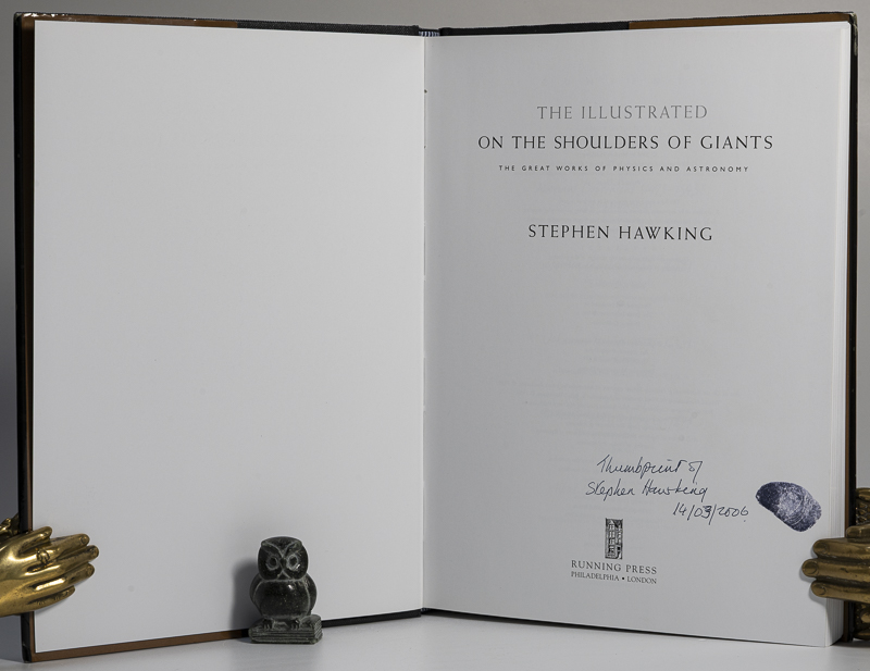 Hawking, Stephen. The Illustrated On the Shoulder of Giants. The Great Works of Physics and Astronomy. First Edition, first Printing. Philadelphia & London, Running Press Book Publishers, 2004. 25 x 18 cm. 256 pages. Illustrated throughout in colour. Original black cloth. Hard cover with gilt title on spine. Inside original dust jacket, now inside clear archival jacket. Fine in very good dust jacket. Dust jacket with mild edge wear and scratching. Now inside protective Brodart jacket. Thumb print of Stephen Hawking on title page, together with text by a secretarial hand. Stephen William Hawking (8 January 1942 – 14 March 2018) was an English theoretical astrophysicist, cosmologist, and author who was director of research at the Centre for Theoretical Cosmology at the University of Cambridge. Between 1979 and 2009, he was the Lucasian Professor of Mathematics at Cambridge, widely viewed as one of the most prestigious academic posts in the world.