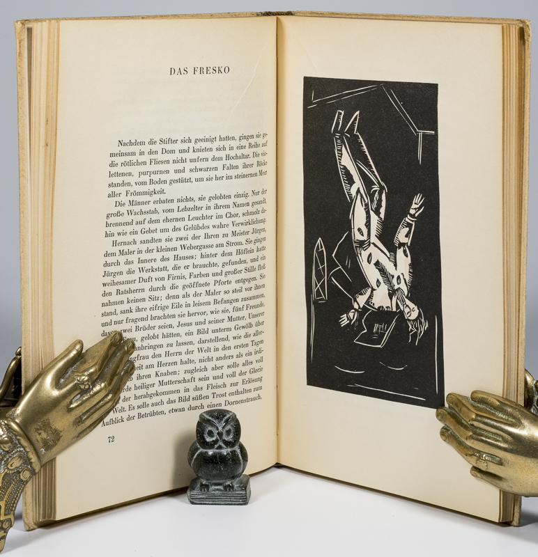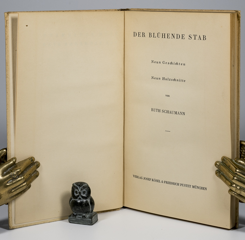 Schaumann, Ruth. Der blühende Stab. Neun Geschichten – Neun Holzschnitte. München, Verlag J. Kösel & F. Pustet, 1929. 8°. 161 Seiten. 9 Holzschnitte. Originales Halbleinen mit illustriertem Einbanddeckel. Sehr guter Zustand mit nur geringen Gebrauchsspuren an der Bindung (etwas nachgedunkelt).