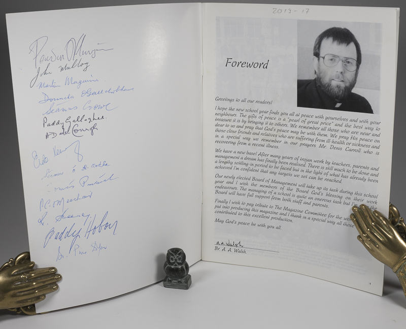 Walsh, Br. A.A. (Editor) / Westport Christian Brothers. Leabhar Tinrimh (Attendance Book) 1865-1987. Special Celebration Book on the Occasion of the Official Opening of Colaiste Ris – December 1987. [Signed by Enda Kenny, Martin Maguire, Peadar O’Flanagain and other Contributors]. Westport, Berrys Printing Works, 1987. 30 x 21 cm. 52 pages. Illustrated throughout in B&W. With many photographs. Original soft paper covers. Paperback. Very good condition. Signed on verso of front cover by various contributors and Enda Kenny, former Taoiseach (Prime Minister of Ireland) Enda Kenny.