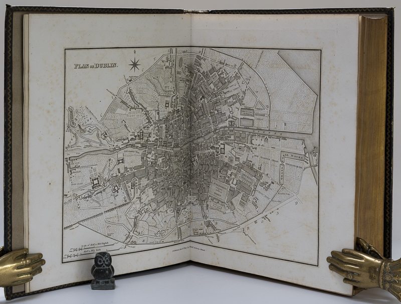 Warburton, J. (The Late) Whitelaw, Rev. J. and Rev. Robert Walsh. History of the City of Dublin. Containing its Annals, Antiquities, Ecclesiastical History & Charters, its present extent, public buildings, schools, institutions etc., to which are added Biographical Notices of eminent men, and copious appendices of its population, revenue, commerce and literature. Illustrated with numerous Plates, Plans and Maps. First Edition. Large Paper Edition. Two Volumes – Complete. London, Printed for T. Cadell and W. Davies in the Strand, 1818. 32 x 25 cm. Vol.1: Frontispiece (Map), Title Page, (6) [Dedication & Preface], xx, 668 pages & 17 Plates / Vol.2: Folding Map of Dublin, Title page, (6) [Dedication & TOC], pages 669 to 1348, cvi, (6) [Corrections & Additions], 9 Plates (incl. one folding Plate) and a large folding Map of the Canals in Ireland. Some small Illustrations in text and numerous Tables and Lists. Some losely inserted newpaper cuttings. Contemporary full straight grained dark blue morocco. Blind tooled borders. Gilt decorations and titles. All edges gilt. Very good condition. Some shelf wear, rubbing and bumping. Volume 1 with some damp staining. Both volumes show mild age darkening and occasional mild foxing. Overall a very nice set in a sturdy attractive binding.