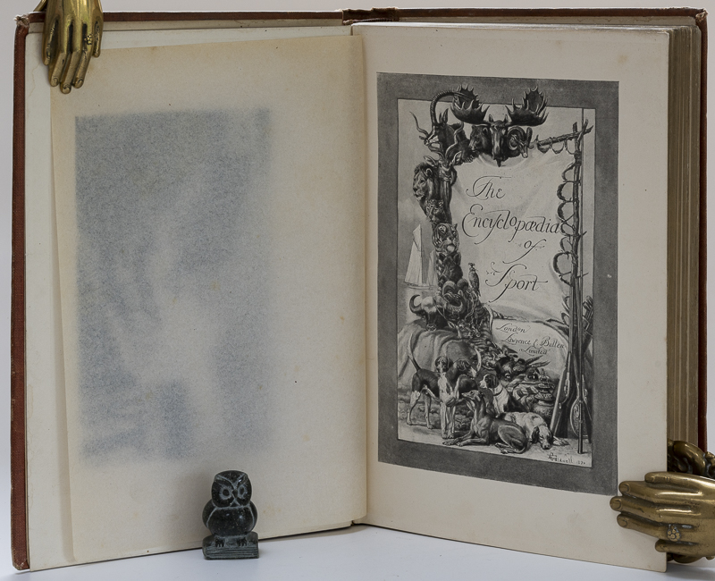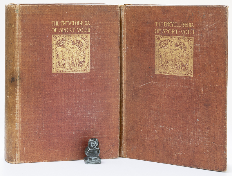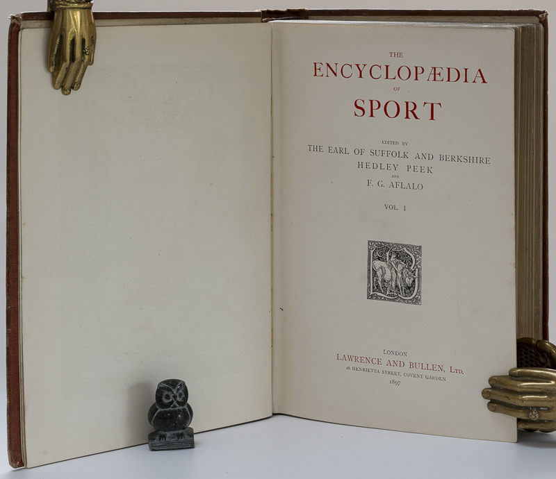 The Earl of Suffolk and Bershire Hedley Peek / Aflalo, F.G. The Encyclopaedia of Sport. First Edition. Two Volumes. London, Lawrence and Bullen, 1897 & 1898. 26 x 18 cm. Vol.1: x, 632 pages / Vol.2: v, 655 pages. Both volumes illustrated throughout in text and many fine, tissue guarded Plates. Original cloth. Gilt decorations and titles. Very good condition. Some shelf wear, rubbing and bumping. Spines faded. Hinges started to open, but binding remains intact. Edges dust dulled. Internally bright and clean.