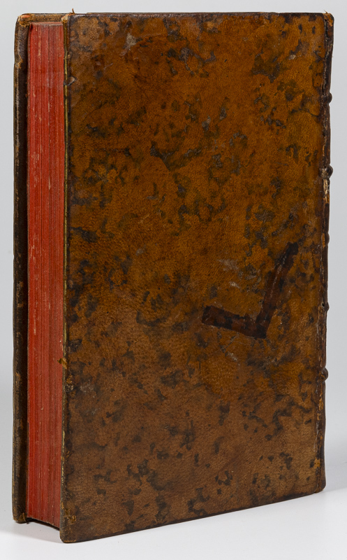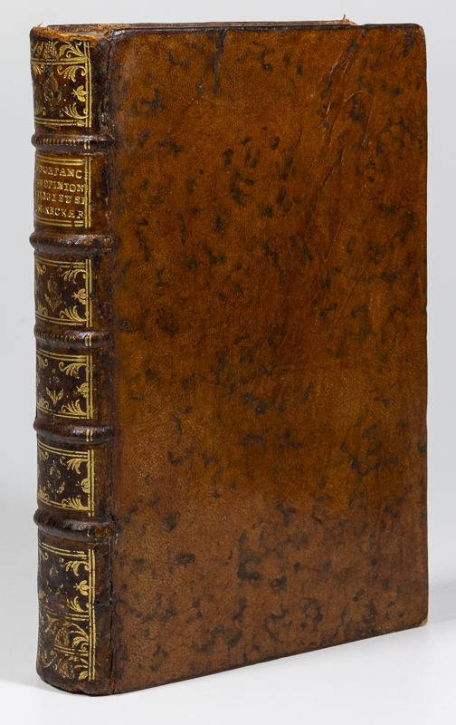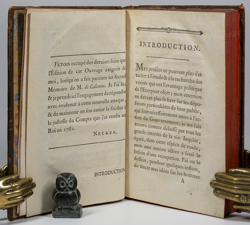 Par M. Necker, [Jacques]. De L’Importance Des Opinions Religieuses First Edition. A Londres, et se trouve à Lyon, chez G. Regnault, 1788. c, 19 x 12 cm. Title page, 542 pages (2). With a Frontispiece. Contemporary speckled calf. Elaborate gilt decorations to spine. Gilt title. Marbled end papers. Red edges. Very good condition. Some shelf wear, rubbing and bumping. Edges dust dulled. Internally bright and clean. A lovely copy. See images.