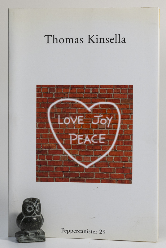 Kinsella, Thomas. Love Joy Peace. Peppercanister 29. First Edition. Dublin, Dedalus Press, 2011. 20 pages. Stiff paper covers with flaps. Soft covers. Very good condition. Minor shelf wear to wrappers. Internally bright and clean.