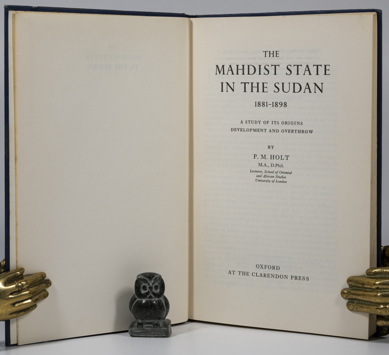 Holt, P.M. The Mahdist State in the Sudan 1881 – 1898. A Study of its Origins, Development and Overthrow. First Edition. Oxford, Clarendon Press, 1958. 21 x 14 cm. vii, 264 pages. Folding maps. Original dark blue cloth. Hard cover. Gilt title. Very good condition. Frontboard stained. Some shelf wear. Internally bright and clean.