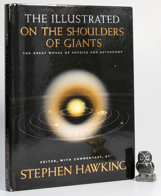 Hawking, Stephen. The Illustrated On the Shoulder of Giants. The Great Works of Physics and Astronomy. First Edition, first Printing. Philadelphia & London, Running Press Book Publishers, 2004. 25 x 18 cm. 256 pages. Illustrated throughout in colour. Original black cloth. Hard cover with gilt title on spine. Inside original dust jacket, now inside clear archival jacket. Fine in very good dust jacket. Dust jacket with mild edge wear and scratching. Now inside protective Brodart jacket. Thumb print of Stephen Hawking on title page, together with text by a secretarial hand. Stephen William Hawking (8 January 1942 – 14 March 2018) was an English theoretical astrophysicist, cosmologist, and author who was director of research at the Centre for Theoretical Cosmology at the University of Cambridge. Between 1979 and 2009, he was the Lucasian Professor of Mathematics at Cambridge, widely viewed as one of the most prestigious academic posts in the world.