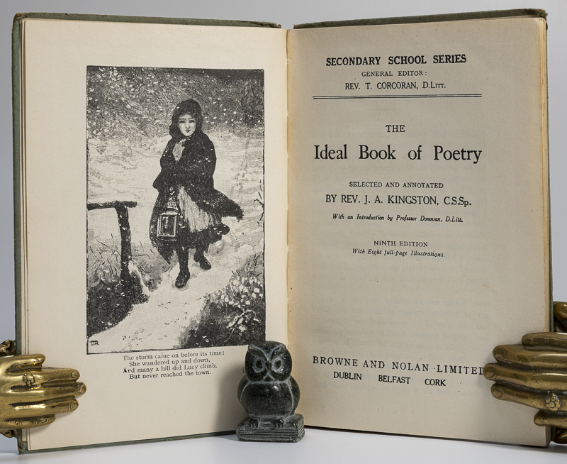 Kingston, Rev. J.A. (editor). The Ideal Book of Poetry. Secondary School Series. With an Introduction by Professor Donovan. Ninth Edition. Dublin et al, Browne and Nolan Limited, ND (Introduction 1915). 18 x 12 cm. vi, 144 pages. With illustrations Stiff cardboard covers. Spine missing. Good condition. Spine missing. Some annotations.