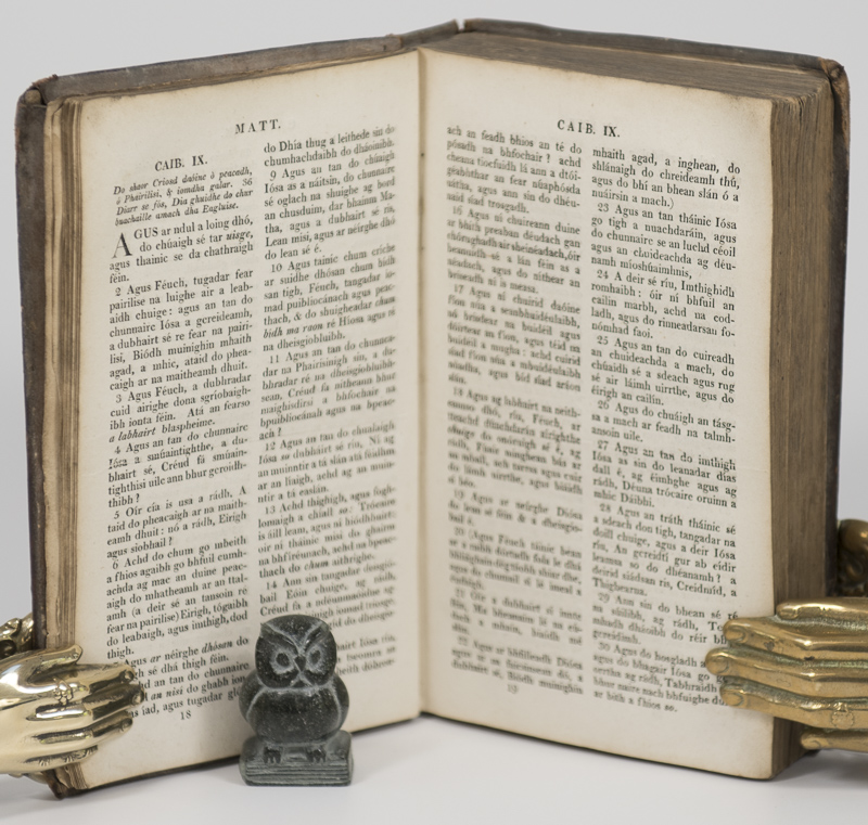 Anon. Tiomna Nuadh Ar Dtighearna. Agus Ar Slanuigheora Iosa Criosd: Ar Na Tharruing Go Firinneach As An Ghreigis Go Gaoidheilg. A Shacklewell, T. Rutt, 1819. 17 x 10.5 cm. 526 pages. Contemporary full calf. Blind stamp of ‘British & Foreign Bible Society’ on front board. Very good condition. Boards, corners and spine rubbed and bumped. Tear to top of spine. Age darkened / dust dulled throughout. Names of previous owners, incl. Rev. D. Magee, Stradbally’ on front pages. Internally clean.