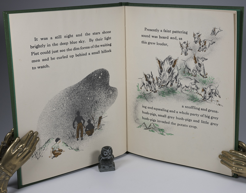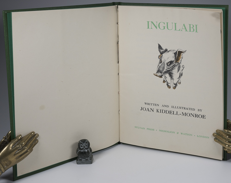Kiddell-Monroe, Joan. Ingulabi. First Edition. London, Sylvan Press – Nicolson & Watson, [1943]. 27 x 20 cm. 48 unnumbered Pages. Illustrated in colour throughout. New (2020) green cloth hard cover. Original paperback front cover has been used for new hardback front board (see images). New green end papers. Very good condition. New binding. Neat (Child) Ex Libris on half title page. Some coloured pencil marks on one page, otherwise bright and clean inside. A nice copy in a new hardback binding with gilt title and author on spine.