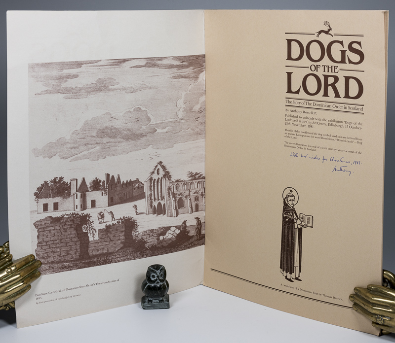 Ross, Anthony. Dogs of the Lord. The Story of the Dominican Order in Scotland. Edinburgh, City Museums and Art Galleries, 1981. 29 x 21 cm. 16 pages. Illustrated throughout. Original stiff decorated paper covers. Stapled paperback. Very good condition. Signed by the author (‘Anthony’) on title page. Internally clean. Minor shelf wear only.