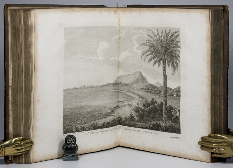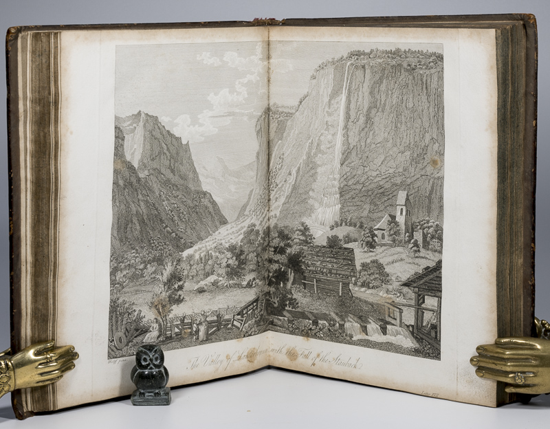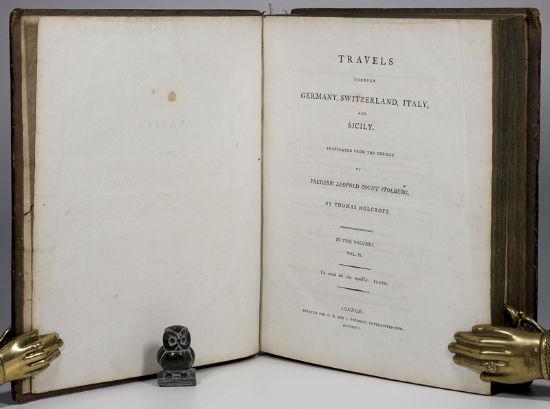 Frederic Leopold Count Stolberg / Holcroft, Thomas (Translator). Travels Through Germany, Switzerland, Italy, and Sicily. Translated from the German of Leopold Count Stolberg, by Thomas Holcroft. First Edition. Two Volumes. London, Printed for G.G. and J. Robinson, 1796. 26 x 21 cm. Vol.1: xx, 506 pages, with eight Plates / Vol.2: xi, 656 pages with eight Plates, plus Directions for the Binder. See Notes below. Contemporary tree calf. Raised bands. Red morroco labels with titles and volume numbers. Very good condition. Rubbed and bumped. Some material losses to spine ends (see images). Internally dust dulled and occasionally mildly foxed. Missing Plates: The following Plates are missing from these books: