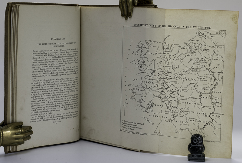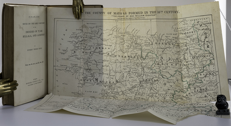 Knox, Hubert Thomas. The History of the County of Mayo. To the Close of the Sixteenth Century. First Edition. Dublin, Hodges, Figgis & Co., 1908. 24 x 16 cm. xvi, (2), 451 pages. Complete with two Plates and three folding Maps. Original brown cloth. Hard cover. Gilt title and decorations. Very good condition. Binding rubbed and bumped. Binding faded (see images). Edges and end papers dust dulled. Name of previous owner on front paste down. Small piece of the large folding Map missing (bottom right corner – see image). A few annotations, otherwise bright and clean.