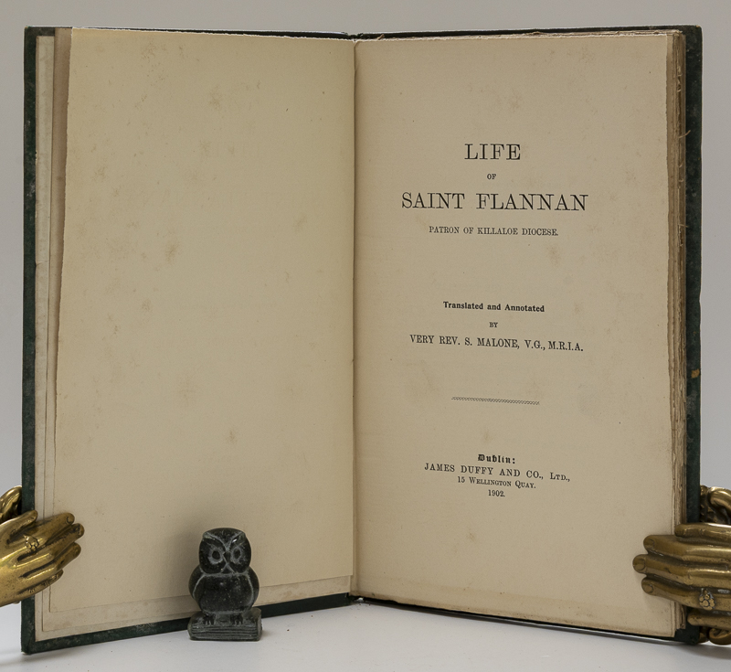 Anon. / Very Rev. S. Malone (translation & annotations). Life of Saint Flannan. Patron of Killaloe Diocese. Translated and Annotated by Very Rev. S. Malone, V.G., M.R.I.A. First Edition. Dublin, James Duffy and Co., 1902. 23 x 15 cm. viii, 56 pages. Original dark green cloth. Gilt title on front board. Blind line decorations. Very good condition. Binding rubbed and bumped. Partially damp stained. See images. Edges and end papers dust dulled. Gift inscription on front free end paper. Internally clean.