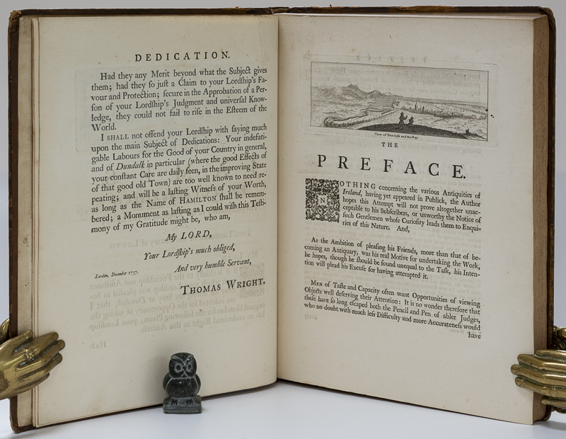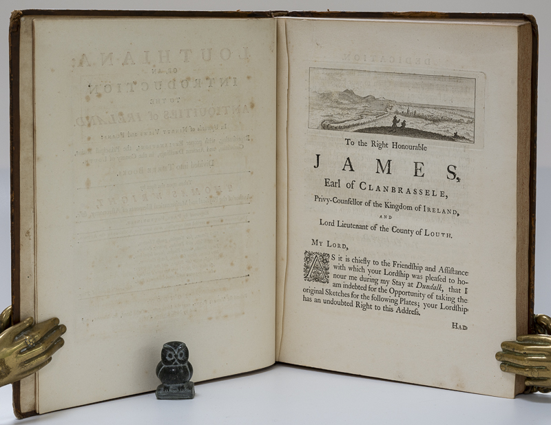 Wright, Thomas, Louthiana. Or, an Introduction to the Antiquities of Ireland. In upwards of Ninety Views and Plans; representing, with proper Explanations, the Principle Ruins, Curiosities, and Antient Dwellings, in the County of Louth. Divided into three Books. Engraved by Paul Fourdrinier. The second Edition, Revised and Corrected, with some few Additions by the Author. London, Printed for Thomas Payne, 1758. 28 x 23 cm. Frontispiece, Title page in red and black, (6) [Dedication and Preface], Book 1: 16 text pages and 20 plates / Book 2: 8 text pages and 24 plates / Book 3: 20 text pages and 22 plates, one blank. Contemporary calf boards. New matching spine with red spine label and gilt title. Raised bands. Red speckled edges. Very good condition. Binding rubbed and bumped. Edges and end papers dust dulled. Internally bright and clean. A very attractive copy. See images.